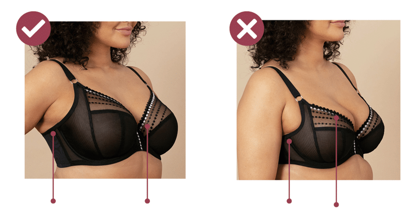 The front and centre wire of a bra should sit flat against the sternum, providing a clear separation between the breasts. It should lie firmly and smoothly against the skin without lifting or pressing into breast tissue. If the wire sits on top of the breasts instead of against the chest, it’s a sign that the cup size is too small and needs to be adjusted. Ensuring the wire sits flush ensures proper support and a comfortable fit.