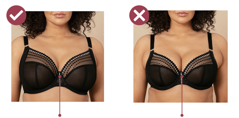 The front and centre wire of a bra should sit flat against the sternum, providing a clear separation between the breasts. It should lie firmly and smoothly against the skin without lifting or pressing into breast tissue. If the wire sits on top of the breasts instead of against the chest, it’s a sign that the cup size is too small and needs to be adjusted. Ensuring the wire sits flush ensures proper support and a comfortable fit.