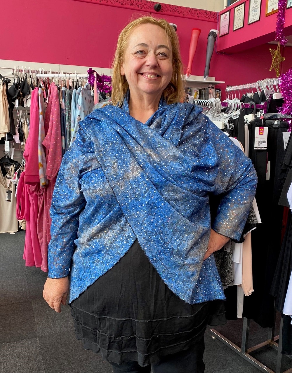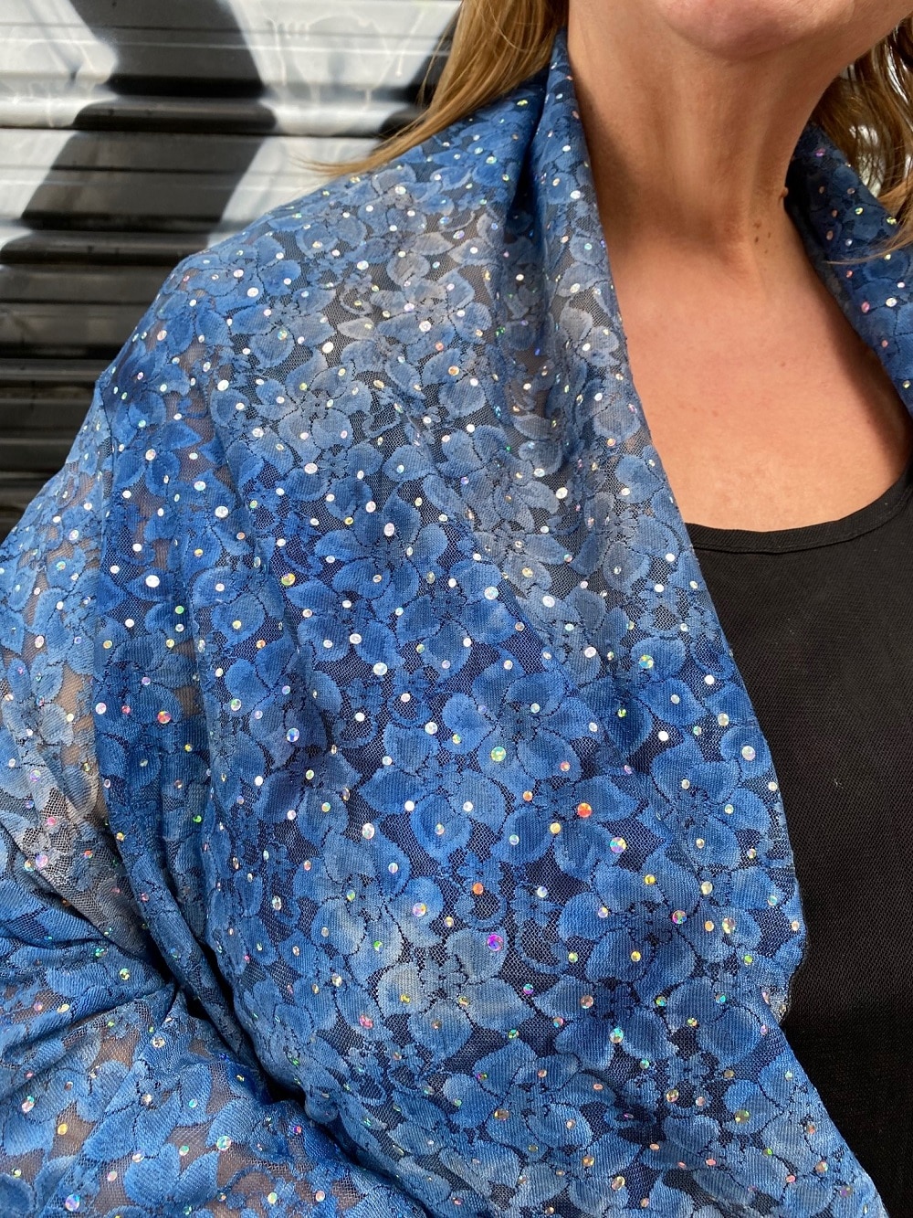 NOW available in our latest fabric Blue Diamond! Stunning Multi toned Blue Floral Lace covered in shimmering twinkling Sequins to add glam sparkle wherever you go!