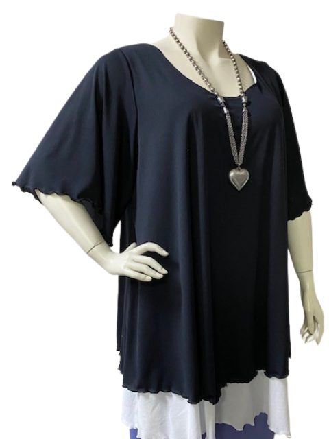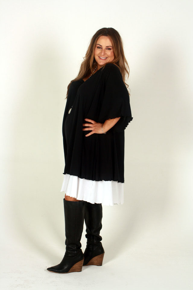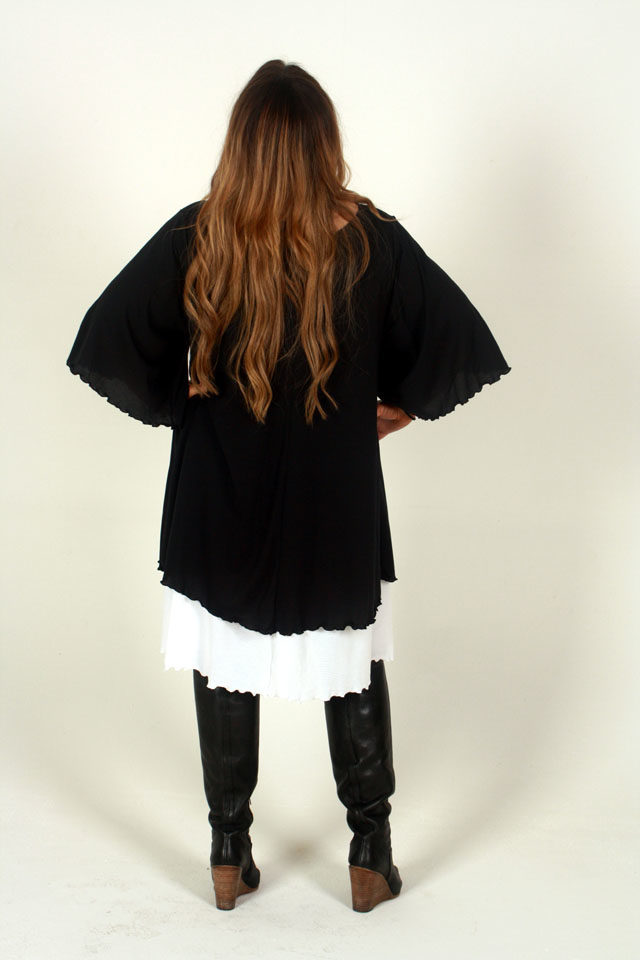 Eva is new to our basics range. Very light black stretch fabric layered over white stretch fabric with a flutter stitch hem on both layers to add a style to any outfit. This simple and elegant top is a must for your wardrobe. Scoop Neck, generous flared elbow length sleeves and lined through to the shoulders with the white longer lining. Long enough to wear as a dress or perfect over a long black skirt or jeans.