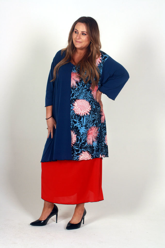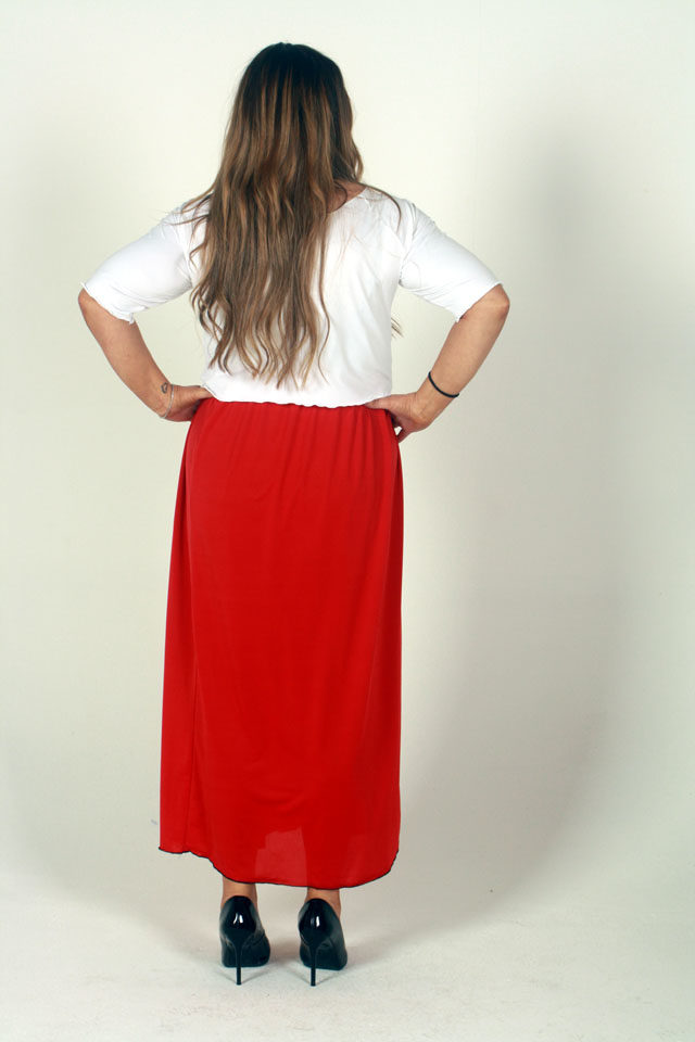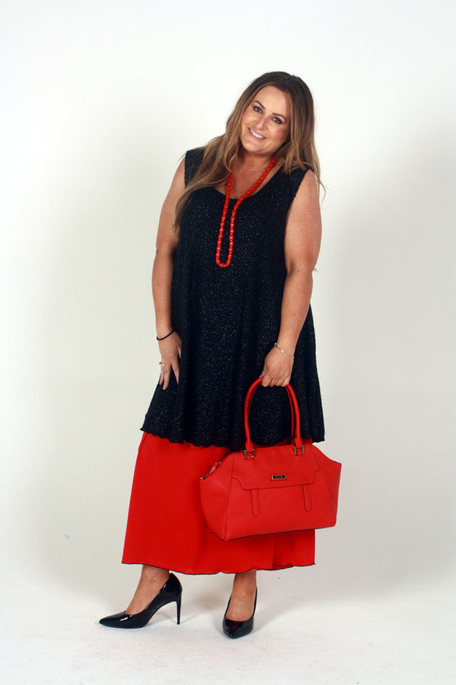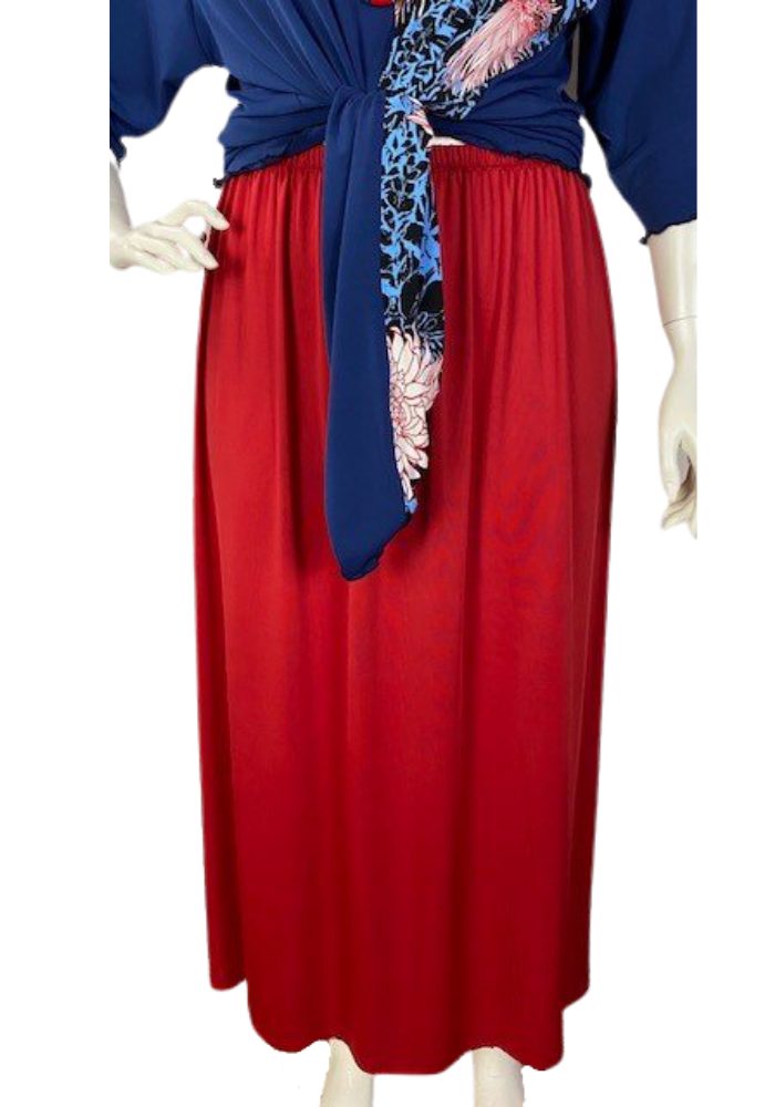 Lisa’s Lacies Long Fiery Red Skirt. Gorgeous, super stretch straight skirt with gathered elastic waist is comfortable and looks great. Brightens up any outfit and adds the perfect red to block colour dressing. Team with one of our tops for a perfect ensemble. Australian Made with love. Lisa’s Lacies – Specialists in Plus Size Clothing for all women!