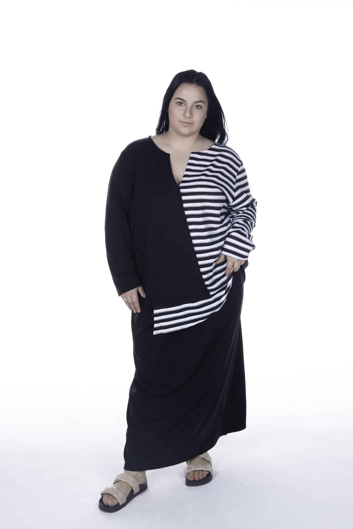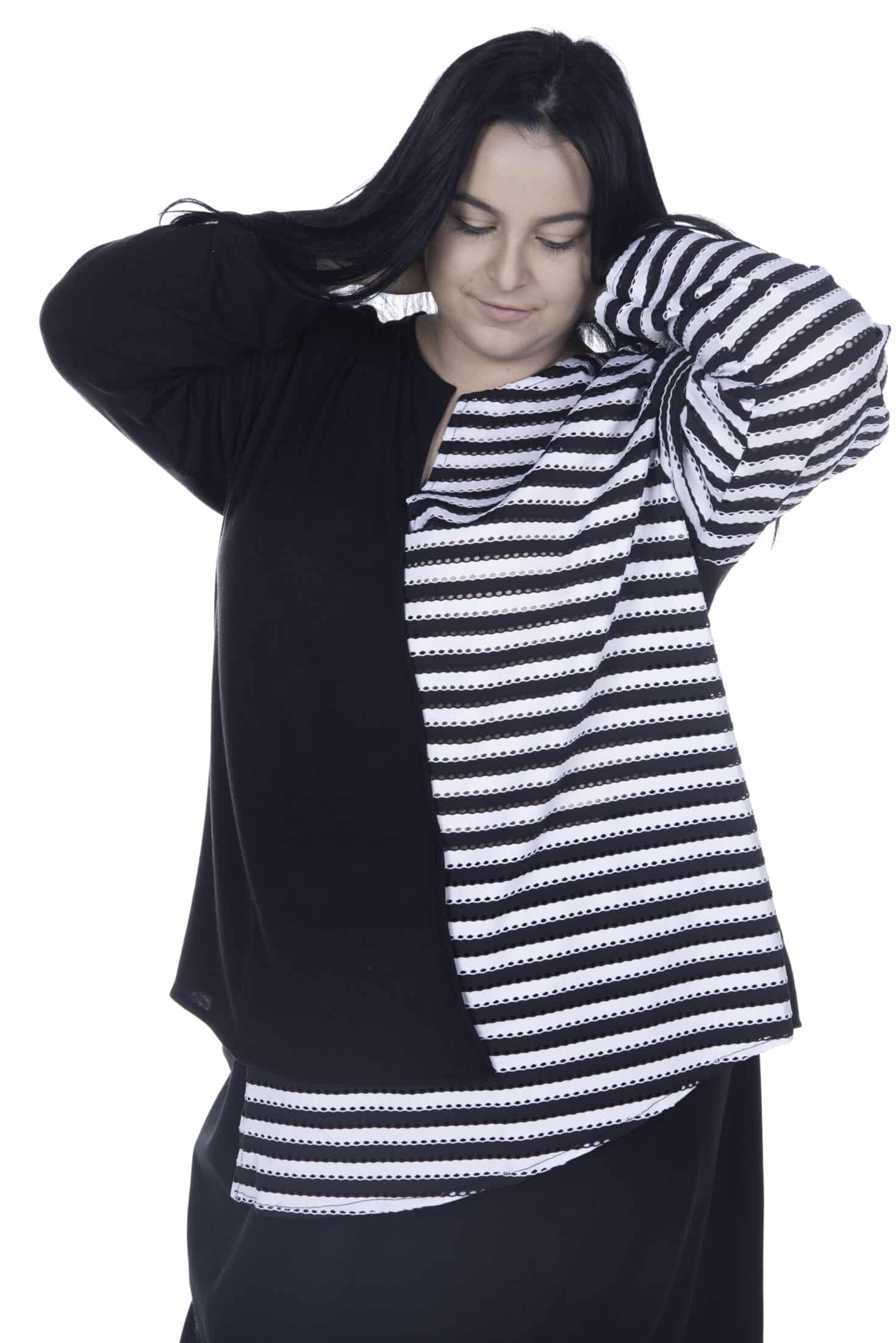 Lisa’s Lacies Zoe Top is a brand new design made with love at Lisa’s Lacies. Made from a combination of soft, stretchy black fabric & black & white striped eyeletted fabric.