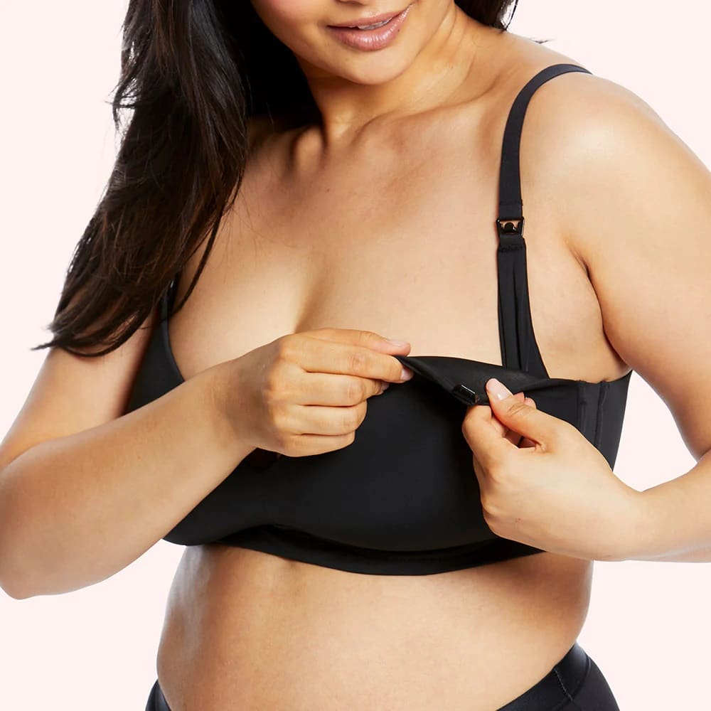 Crafted from silky soft recycled nylon, this bra features nifty pockets inside each cup to hold removable, washable nursing pads securely in place. No more dealing with pads moving around—stay comfortable and confident all day long!
