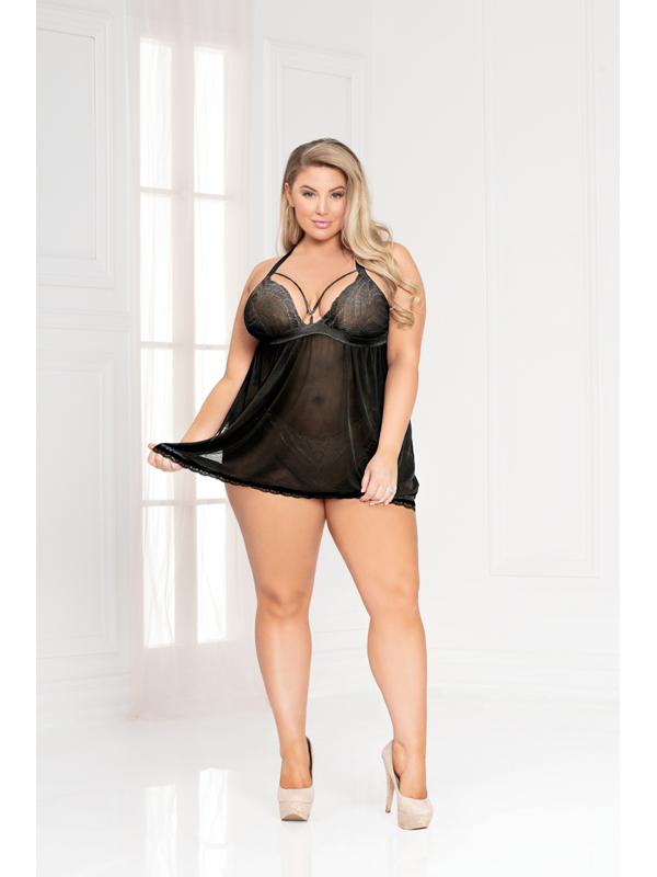 Set the scene for a night of irresistible allure in the Smitten Babydoll Set. This seductive two-piece set includes a lace and mesh babydoll with strappy details and a delicate lace trim, paired with a matching panty to complete the look. Perfect for adding a touch of sultry elegance to your evening.