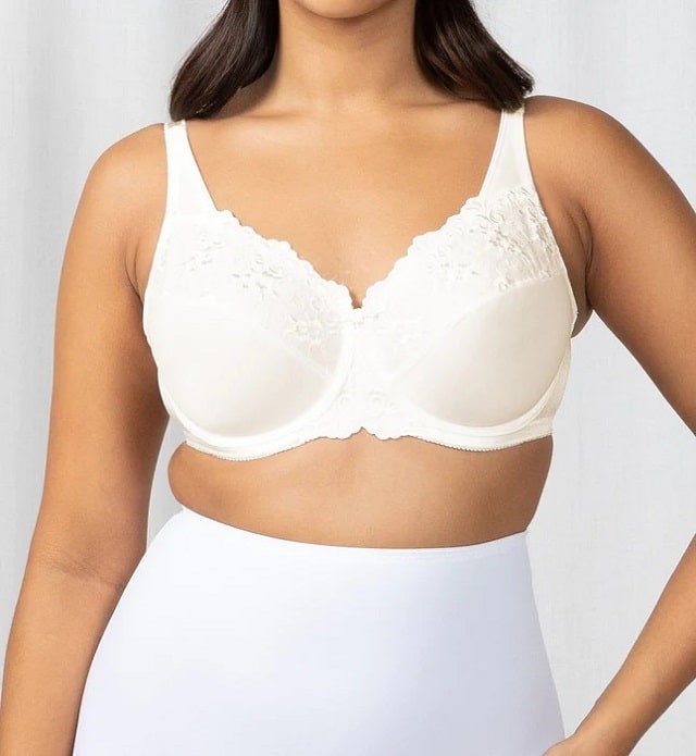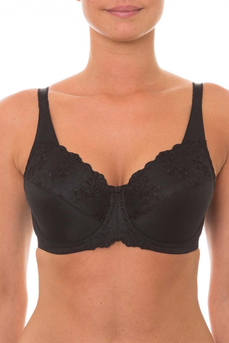 Triumph Embroidered Minimiser UW Bra. Minimise your bust by up to one cup size in this best selling minimiser bra. Triumph’s famous Embroidered Minimiser features firm, rigid fabric which holds the bust in and prevents unflattering strain across the front of tailored tops. Pretty embroidery adorns the top cup and centre front. A strong powernet at back provides support.